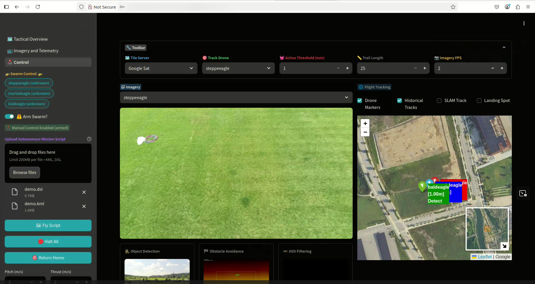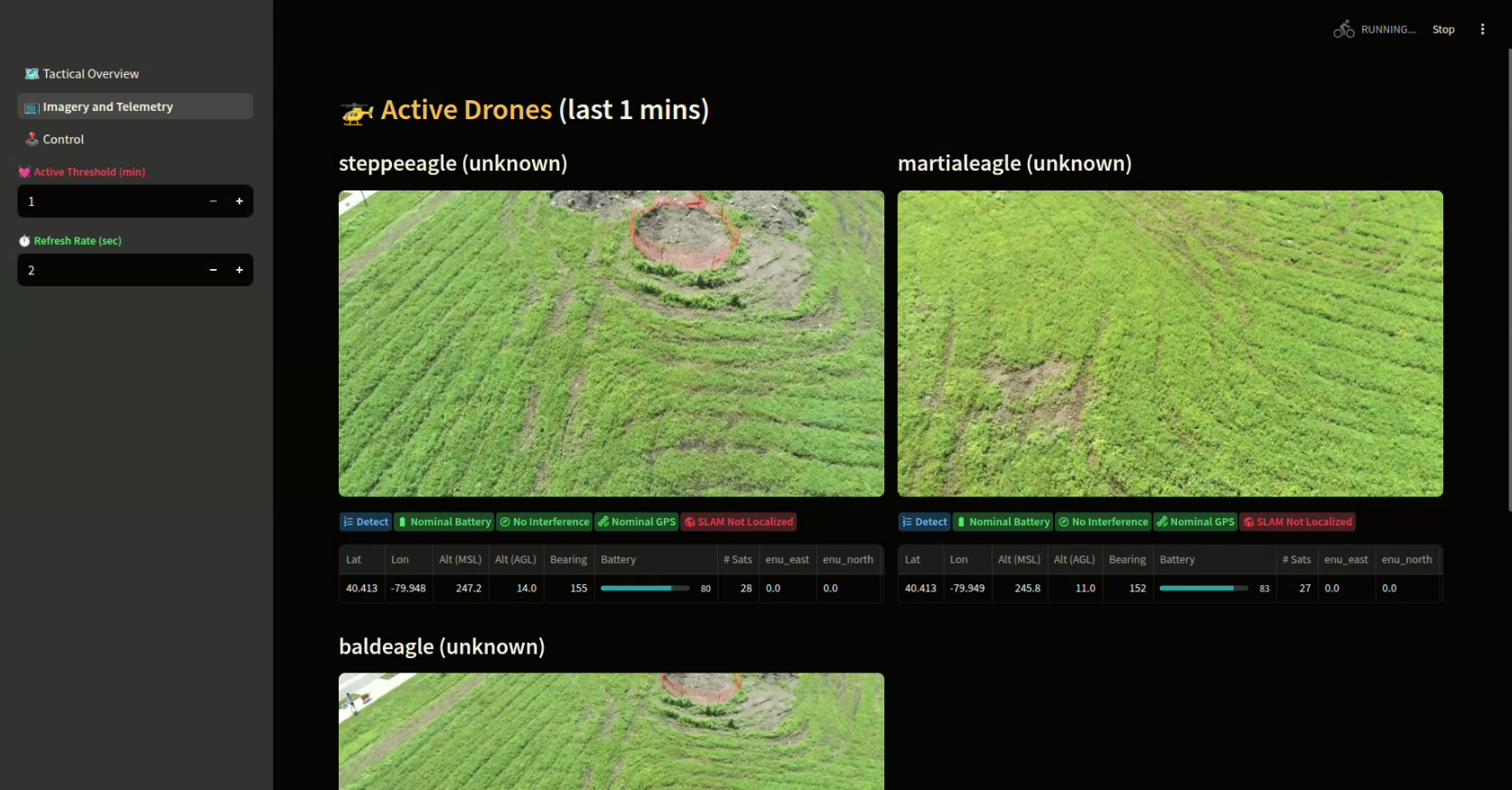 SteelEagle utilizes a custom Ground Control Station which is currently written in Streamlit which is a pure python web frontend. The SteelEagle GCS allows a pilot-in-command (PiC) to control one or more vehicles manually, send them on autonomous missions, and view telemetry and image data from connected vehicles.