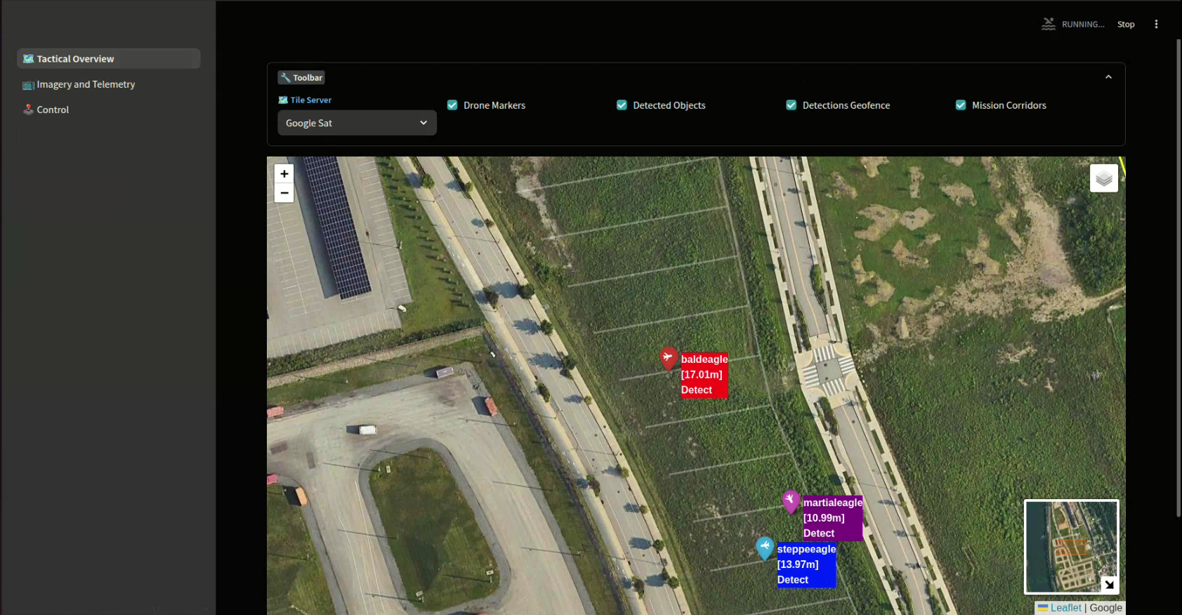 On the left of the GCS, there is a sidebar which has several pages. The default page is the Tactical Overview. This page shows a large map with controls to show/hide various entities (vehicle markers, detected objects, geofence, and mission corridors). The toolbar also has a control to change the tileserver for the map. This toolbar as well as the sidebar can be collapsed.